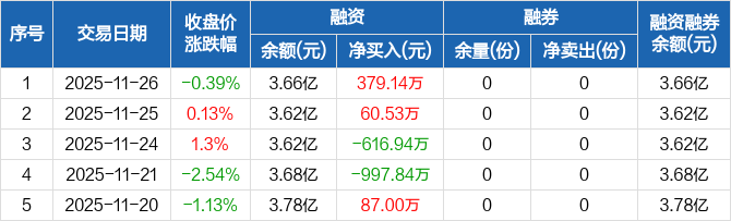 融資方面,當(dāng)日融資買入946.92萬元,融資償還567.78萬元,融資凈買入379.14萬元。融券方面,融券賣出0份,融券償還0份,融券余量0份,融券余額0元。融資融券余額合計(jì)3.66億元。