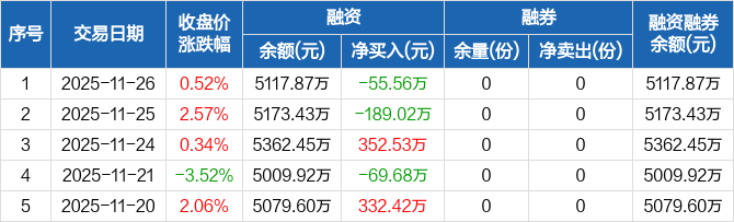 融資方面,當(dāng)日融資買入438.05萬元,融資償還493.61萬元,融資凈償還55.56萬元。融券方面,融券賣出0份,融券償還0份,融券余量0份,融券余額0元。融資融券余額合計(jì)5117.87萬元。