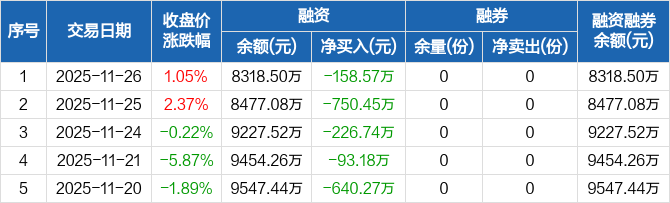 融資方面,當(dāng)日融資買入1162.15萬元,融資償還1320.72萬元,融資凈償還158.57萬元,連續(xù)6日凈償還累計(jì)2598.6萬元。融券方面,融券賣出0份,融券償還0份,融券余量0份,融券余額0元。融資融券余額合計(jì)8318.5萬元。