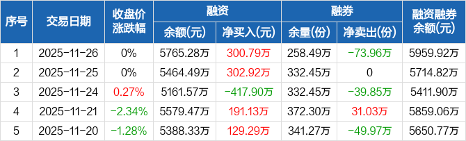 融資方面,當(dāng)日融資買入1061.29萬元,融資償還760.5萬元,融資凈買入300.79萬元。融券方面,融券賣出4.63萬份,融券償還78.59萬份,融券余量258.49萬份,融券余額194.64萬元。融資融券余額合計5959.92萬元。