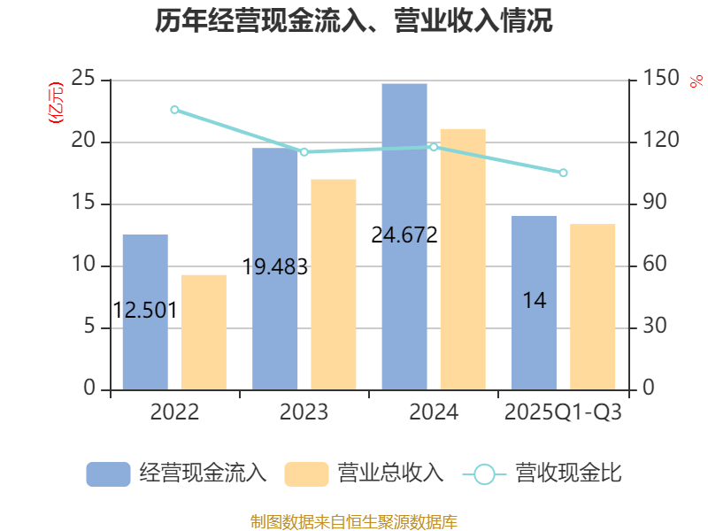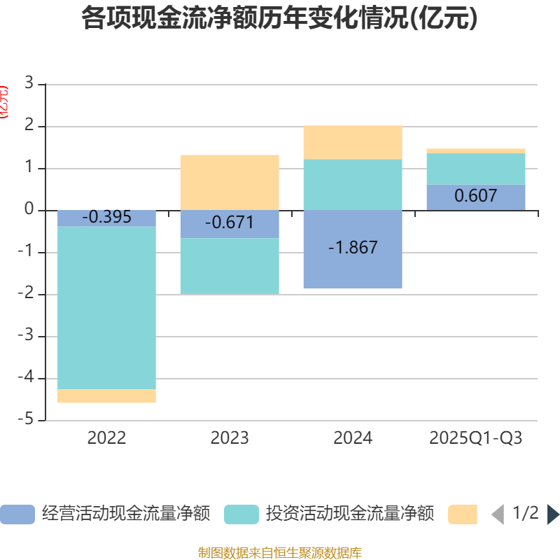 2025年前三季度,公司經(jīng)營活動現(xiàn)金流凈額為6071.57萬元,同比增加1.25億元;籌資活動現(xiàn)金流凈額1093.7萬元,同比減少4993.63萬元;投資活動現(xiàn)金流凈額7447.73萬元,上年同期為1.5億元。