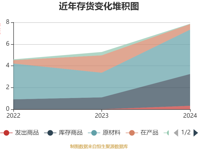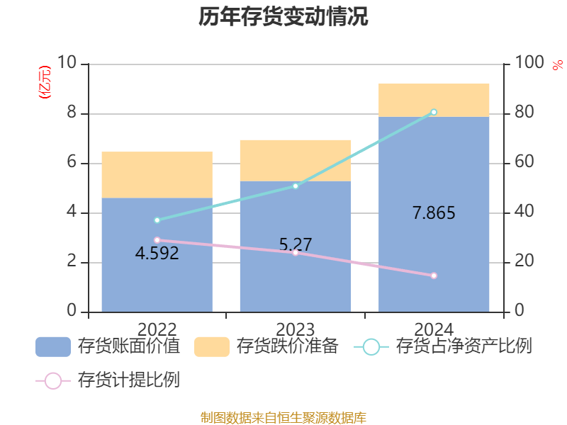 從存貨變動來看,截至2024年末,公司存貨賬面價值為7.87億元,占凈資產(chǎn)的80.48%,較上年末增加2.6億元。其中,存貨跌價準備為1.34億元,計提比例為14.52%。