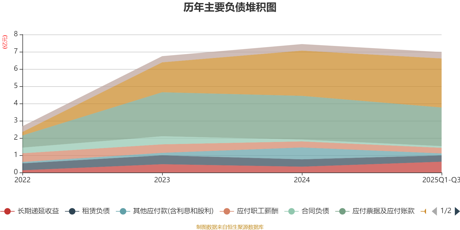 負債重大變化方面,截至2025年三季度末,公司其他應(yīng)付款(含利息和股利)較上年末減少83%,占公司總資產(chǎn)比重下降3.27個百分點;短期借款較上年末增加8.42%,占公司總資產(chǎn)比重上升2.41個百分點;長期遞延收益較上年末增加85.06%,占公司總資產(chǎn)比重上升1.91個百分點;應(yīng)付票據(jù)及應(yīng)付賬款較上年末減少11.56%,占公司總資產(chǎn)比重下降0.81個百分點。