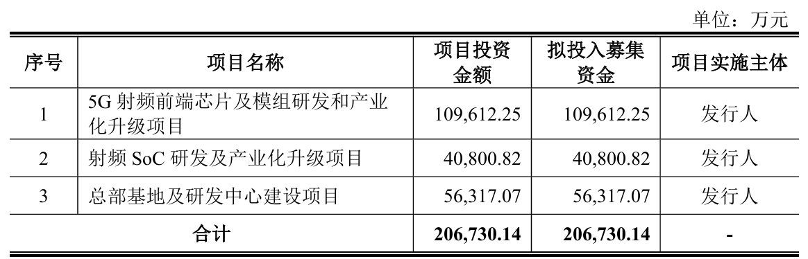 招股書顯示,本次募投項目中,5G射頻前端芯片及模組研發(fā)和產(chǎn)業(yè)化升級項目運用公司當(dāng)前在射頻前端領(lǐng)域的產(chǎn)品和技術(shù)儲備,進一步開發(fā)升級用于手機及可穿戴設(shè)備的高集成度、高技術(shù)難度射頻前端模組及相關(guān)分立器件、高可靠性車載通信射頻前端模組等;射頻SoC研發(fā)及產(chǎn)業(yè)化升級項目基于公司當(dāng)前在射頻SoC領(lǐng)域的產(chǎn)品和技術(shù)儲備,根據(jù)協(xié)議標準的更新要求,升級研發(fā)低功耗藍牙芯片、高性能藍牙音頻芯片和支持包括藍牙、Zigbee、Matter、Thread、HomeKit、星閃等物聯(lián)網(wǎng)協(xié)議標準的無線物聯(lián)網(wǎng)多協(xié)議芯片產(chǎn)品;總部基地及研發(fā)中心建設(shè)項目在打造產(chǎn)品研發(fā)、日常辦公等功能于一體的總部基地及研發(fā)中心的同時,在公司現(xiàn)有射頻技術(shù)與產(chǎn)品的積累上,進行涵蓋衛(wèi)星通信射頻前端芯片、WiFi射頻前端模組及基站射頻前端芯片等前沿射頻前端技術(shù)研發(fā)。