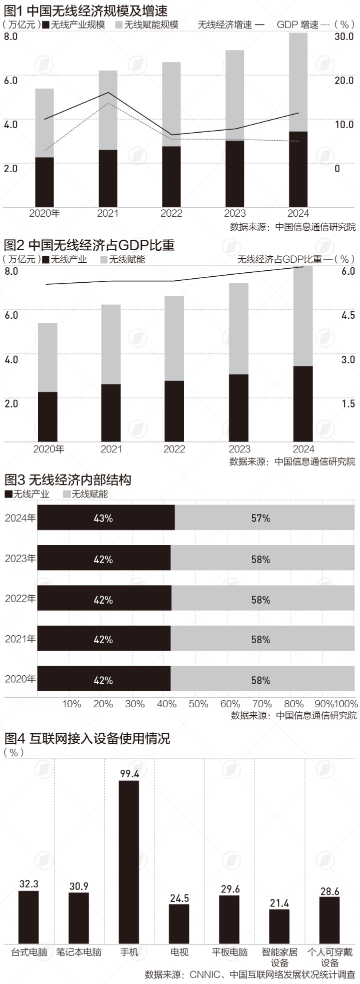 中國無線經(jīng)濟(jì)規(guī)模在2024年已達(dá)到7.9萬億元,同比增長(zhǎng)11.1%;“十四五”以來,無線經(jīng)濟(jì)占GDP比重逐年提升,由5.3%提升至5.9%。