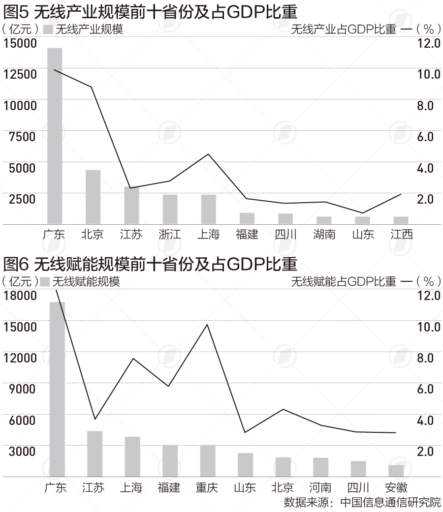 從分省份無線賦能規(guī)???,廣東、江蘇、上海位列無線賦能總量第一梯隊(duì);廣東、重慶、上海位列無線賦能占GDP比重第一梯隊(duì)。