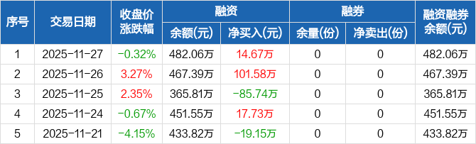 融資方面,當(dāng)日融資買入173.85萬元,融資償還159.18萬元,融資凈買入14.67萬元。融券方面,融券賣出0份,融券償還0份,融券余量0份,融券余額0元。融資融券余額合計(jì)482.06萬元。