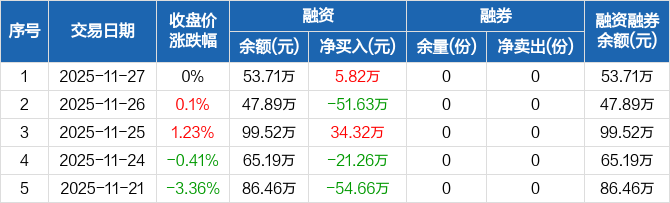 融資方面,當日融資買入17.73萬元,融資償還11.91萬元,融資凈買入5.82萬元。融券方面,融券賣出0份,融券償還0份,融券余量0份,融券余額0元。融資融券余額合計53.71萬元。