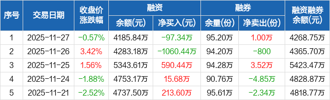 融資方面,當(dāng)日融資買入639.16萬元,融資償還736.5萬元,融資凈償還97.34萬元。融券方面,融券賣出1.75萬份,融券償還7500份,融券余量95.2萬份,融券余額82.92萬元。融資融券余額合計(jì)4268.75萬元。