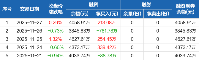 融資方面,當(dāng)日融資買入962.76萬元,融資償還749.68萬元,融資凈買入213.08萬元。融券方面,融券賣出0份,融券償還0份,融券余量0份,融券余額0元。融資融券余額合計4058.91萬元。