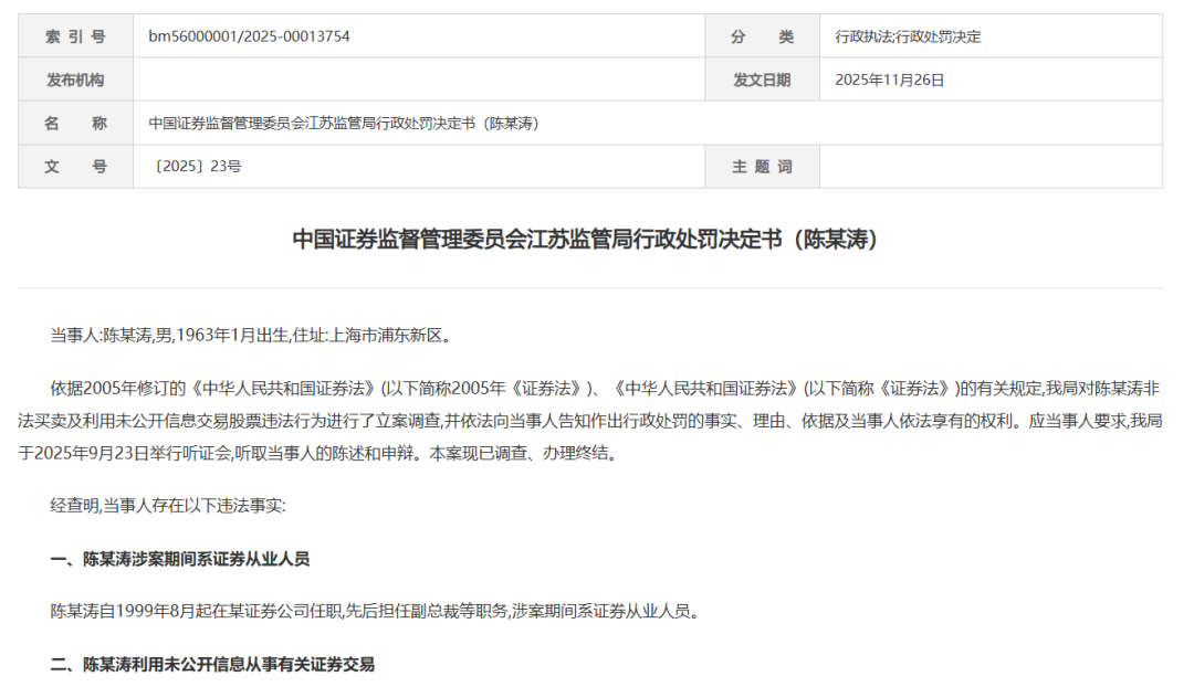 依據(jù)相關(guān)規(guī)定,江蘇證監(jiān)局決定對(duì)陳某濤利用未公開信息交易行為,沒(méi)收違法所得1875.04萬(wàn)元,并處以3750.08萬(wàn)元罰款;對(duì)陳某濤違規(guī)買賣證券行為,沒(méi)收違法所得2640.01萬(wàn)元,并處以5280.02萬(wàn)元罰款?!皼](méi)一罰二”合計(jì)罰沒(méi)1.35億元。