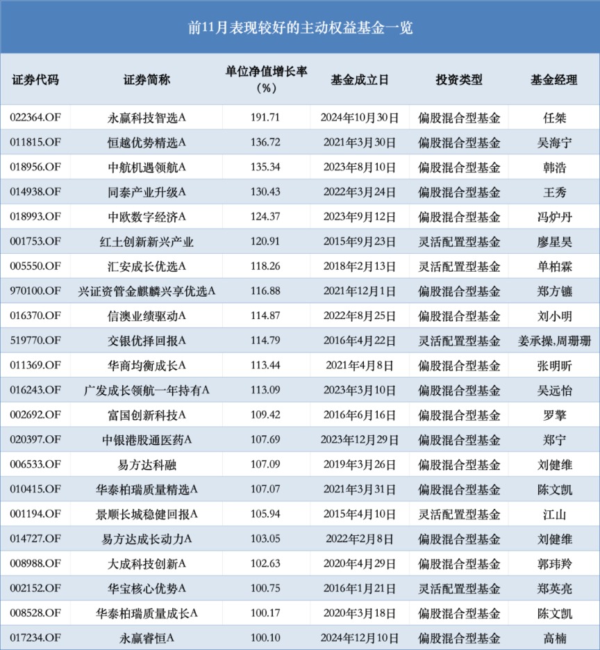 【導(dǎo)讀】前11月主動權(quán)益基金平均業(yè)績超27%,38只“翻倍基”,最牛超190%