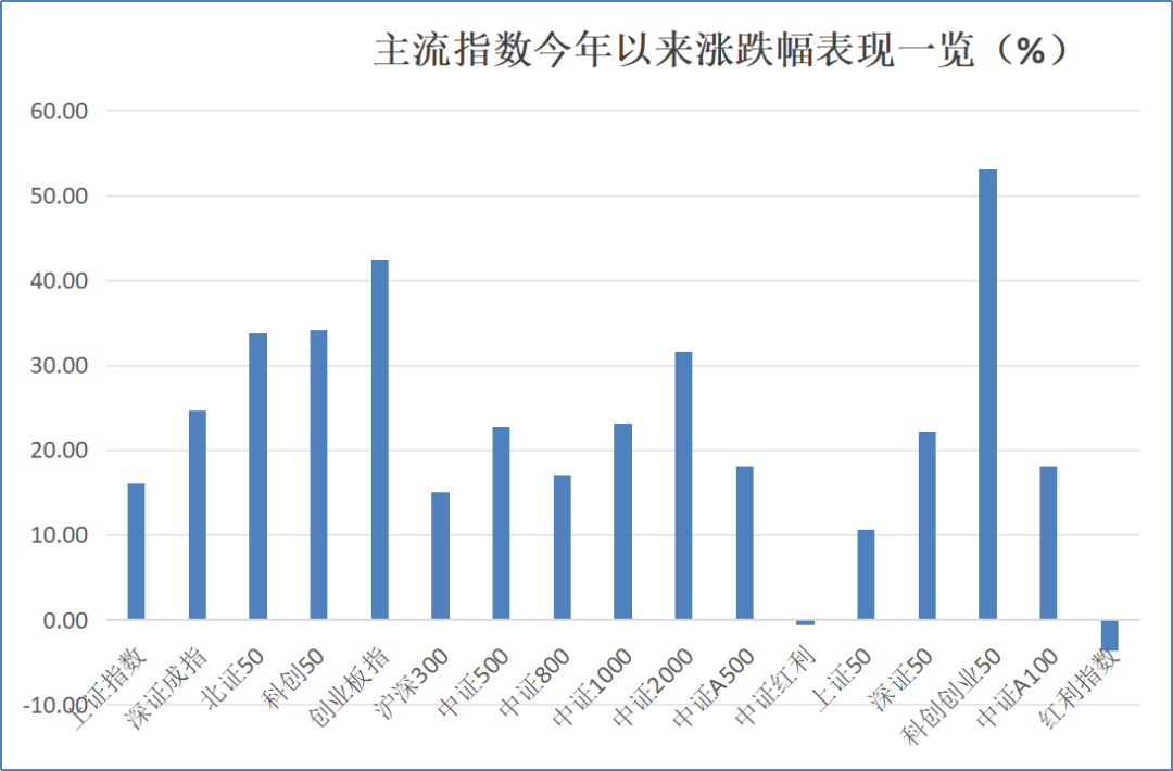 具體來看,主流指數(shù)前11月基本維持上漲行情,其中科創(chuàng)創(chuàng)業(yè)50、創(chuàng)業(yè)板指等指數(shù)表現(xiàn)神勇,年內(nèi)漲幅均超40%,分別達到53.17%、42.54%;科創(chuàng)50、北證50、中證2000等指數(shù)也表現(xiàn)強勢,漲幅超30%。不過,中證紅利指數(shù)、紅利指數(shù)出現(xiàn)小幅下跌。