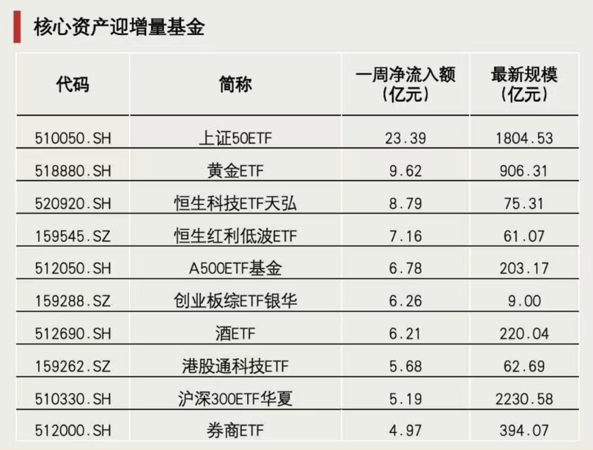在近期震蕩的行情下,以上證50為代表的核心資產(chǎn)迎來增量資金,跟蹤上證50指數(shù)的ETF上周合計凈流入超25億元。