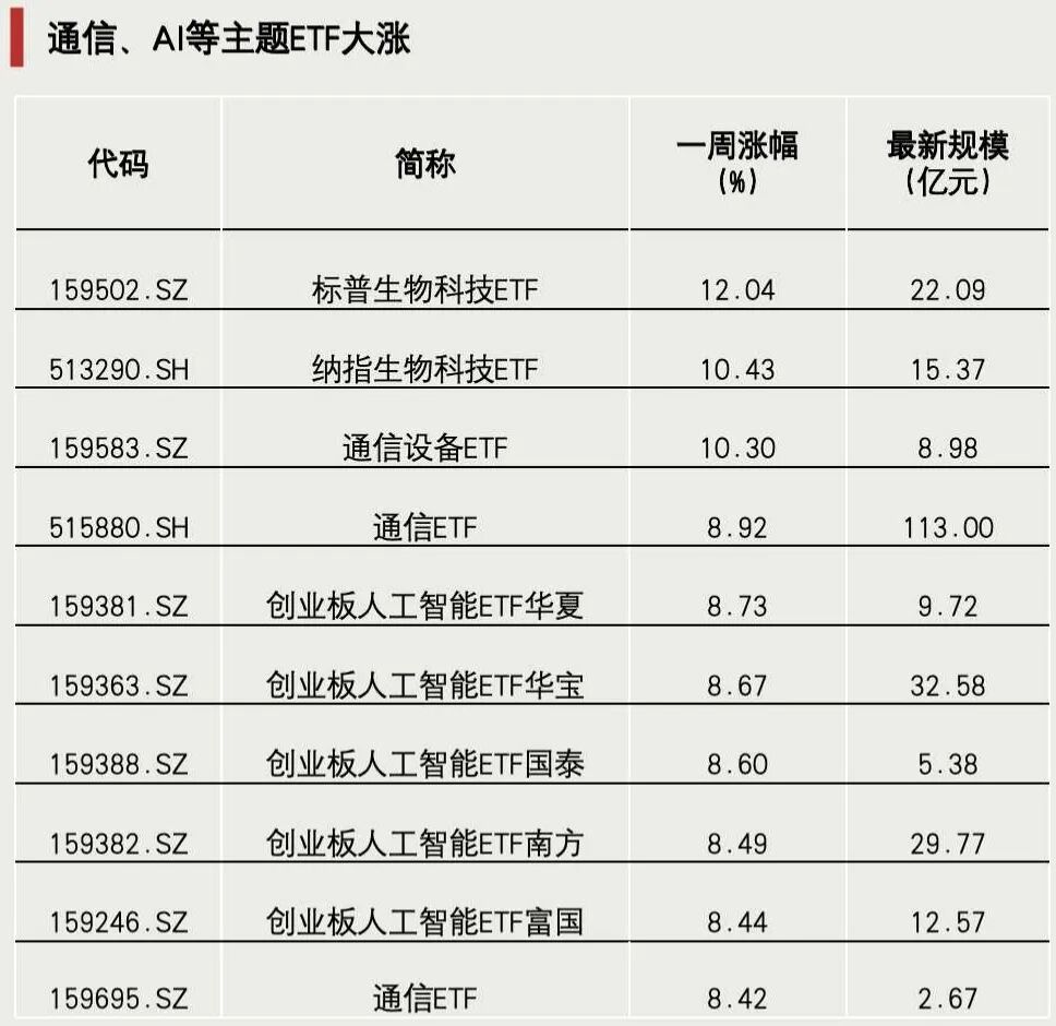 上周(11月24日至11月28日),以算力為首的科技板塊繼續(xù)保持強勁勢頭,多只通信、創(chuàng)業(yè)板人工智能主題ETF漲超8%。