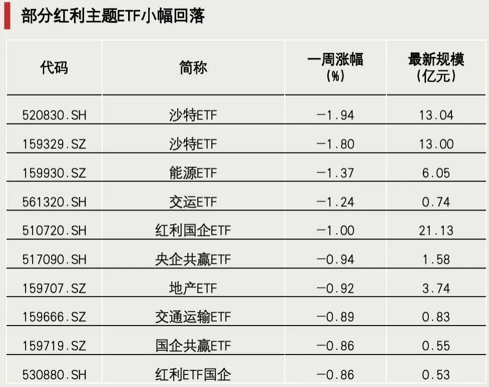在成長風(fēng)格走強的情況下,上周部分能源、交運以及國企紅利等主題ETF小幅回落。此外,沙特ETF等跨境品種也出現(xiàn)回調(diào)。