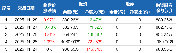 融資方面,當(dāng)日融資買入58.13萬元,融資償還60.6萬元,融資凈償還2.47萬元,連續(xù)3日凈償還累計(jì)180.64萬元。融券方面,融券賣出0份,融券償還0份,融券余量0份,融券余額0元。融資融券余額合計(jì)880.26萬元。