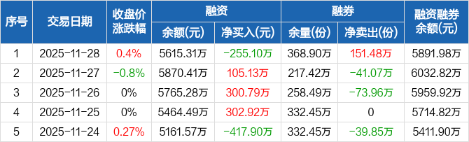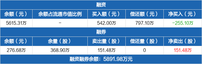 融資方面,當日融資買入542萬元,融資償還797.1萬元,融資凈償還255.1萬元。融券方面,融券賣出151.48萬份,融券償還0份,融券余量368.9萬份,融券余額276.68萬元。融資融券余額合計5891.98萬元。
