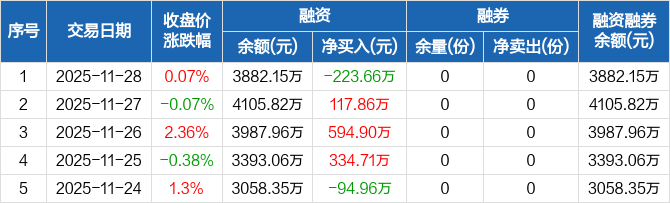 融資方面,當日融資買入1039.28萬元,融資償還1262.94萬元,融資凈償還223.66萬元。融券方面,融券賣出0份,融券償還0份,融券余量0份,融券余額0元。融資融券余額合計3882.15萬元。