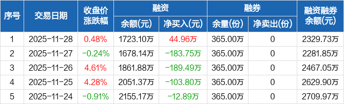 融資方面,當(dāng)日融資買入207.01萬元,融資償還162.05萬元,融資凈買入44.96萬元。融券方面,融券賣出0份,融券償還0份,融券余量365萬份,融券余額606.63萬元。融資融券余額合計(jì)2329.73萬元。