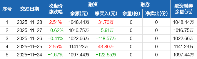 融資方面,當(dāng)日融資買入411.92萬元,融資償還380.22萬元,融資凈買入31.7萬元。融券方面,融券賣出0份,融券償還0份,融券余量0份,融券余額0元。融資融券余額合計(jì)1048.44萬元。