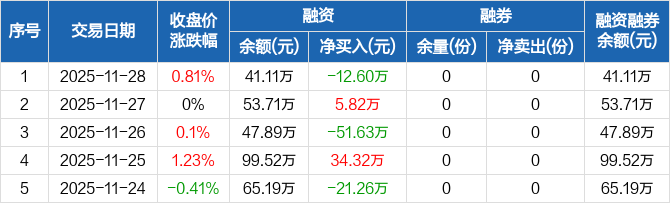 融資方面,當(dāng)日融資買入10.21萬元,融資償還22.81萬元,融資凈償還12.6萬元。融券方面,融券賣出0份,融券償還0份,融券余量0份,融券余額0元。融資融券余額合計(jì)41.11萬元。