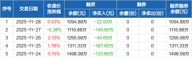 融資方面,當(dāng)日融資買入134.14萬(wàn)元,融資償還156.14萬(wàn)元,融資凈償還22萬(wàn)元,連續(xù)5日凈償還累計(jì)537.97萬(wàn)元。融券方面,融券賣出0份,融券償還0份,融券余量0份,融券余額0元。融資融券余額合計(jì)1094.88萬(wàn)元。
