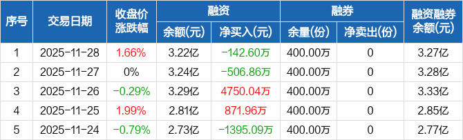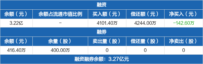 融資方面,當(dāng)日融資買(mǎi)入4101.4萬(wàn)元,融資償還4244萬(wàn)元,融資凈償還142.6萬(wàn)元。融券方面,融券賣(mài)出0份,融券償還0份,融券余量400萬(wàn)份,融券余額416.4萬(wàn)元。融資融券余額合計(jì)3.27億元。
