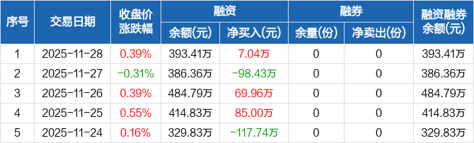 融資方面,當(dāng)日融資買入105.09萬元,融資償還98.05萬元,融資凈買入7.04萬元。融券方面,融券賣出0份,融券償還0份,融券余量0份,融券余額0元。融資融券余額合計(jì)393.41萬元。