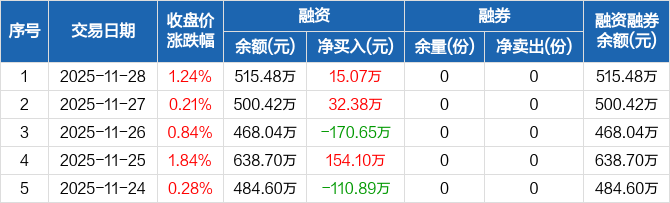 融資方面,當(dāng)日融資買入173.29萬(wàn)元,融資償還158.22萬(wàn)元,融資凈買入15.07萬(wàn)元。融券方面,融券賣出0份,融券償還0份,融券余量0份,融券余額0元。融資融券余額合計(jì)515.48萬(wàn)元。