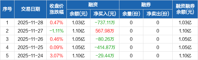 融資方面,當日融資買入560.93萬元,融資償還1298.04萬元,融資凈償還737.11萬元。融券方面,融券賣出0份,融券償還0份,融券余量0份,融券余額0元。融資融券余額合計1.03億元。