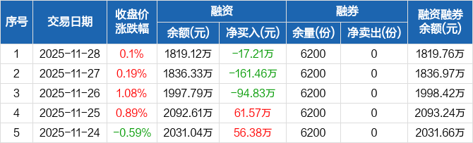 融資方面,當(dāng)日融資買入120.59萬元,融資償還137.79萬元,融資凈償還17.21萬元,連續(xù)3日凈償還累計273.49萬元。融券方面,融券賣出0份,融券償還0份,融券余量6200份,融券余額6386元。融資融券余額合計1819.76萬元。