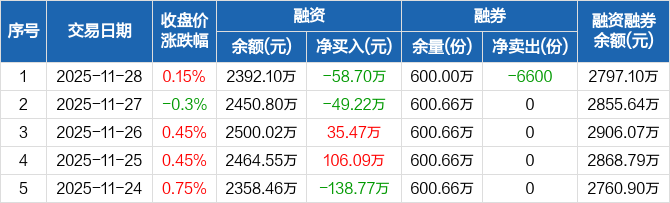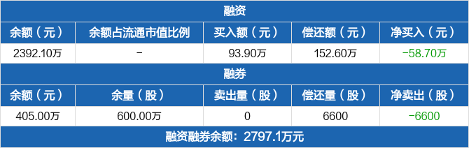 融資方面,當(dāng)日融資買入93.9萬元,融資償還152.6萬元,融資凈償還58.7萬元。融券方面,融券賣出0份,融券償還6600份,融券余量600萬份,融券余額405萬元。融資融券余額合計(jì)2797.1萬元。