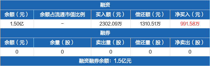 融資方面,當日融資買入2302.09萬元,融資償還1310.51萬元,融資凈買入991.58萬元。融券方面,融券賣出0份,融券償還0份,融券余量0份,融券余額0元。融資融券余額合計1.5億元。