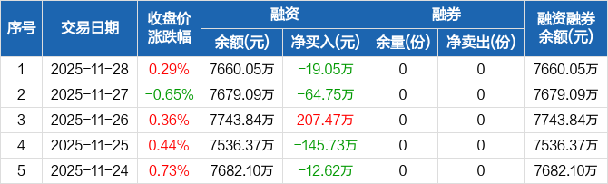 融資方面,當日融資買入258.6萬元,融資償還277.65萬元,融資凈償還19.05萬元。融券方面,融券賣出0份,融券償還0份,融券余量0份,融券余額0元。融資融券余額合計7660.05萬元。