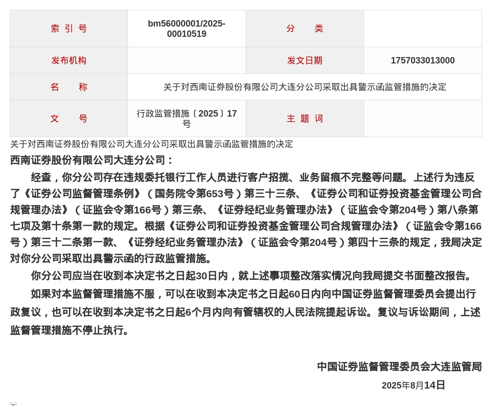 西南證券大連分公司被出具警示函,涉違規(guī)招攬客戶等