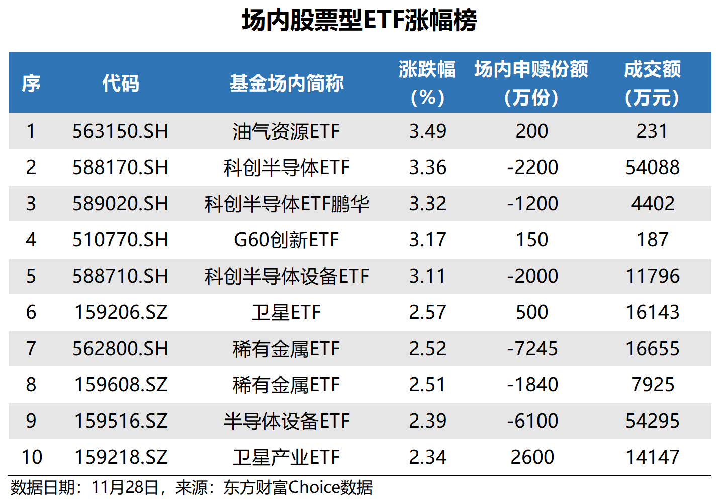 數(shù)據(jù)顯示,上周五場內(nèi)股票型ETF中,油氣資源ETF、科創(chuàng)半導(dǎo)體ETF、科創(chuàng)半導(dǎo)體ETF鵬華漲幅居前。其中,油氣資源ETF漲幅最大,為3.49%。