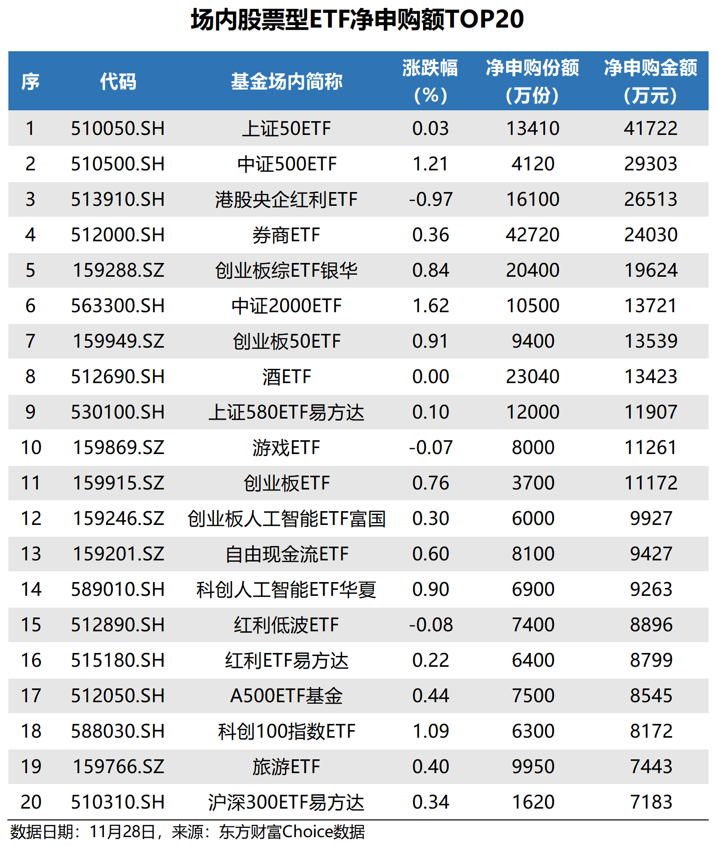 上周五,凈申購金額最多的為上證50ETF,凈申購金額為4.17億元。此外,中證500ETF和港股央企紅利ETF也獲購居前,凈申購金額依次為2.93億元和2.65億元。
