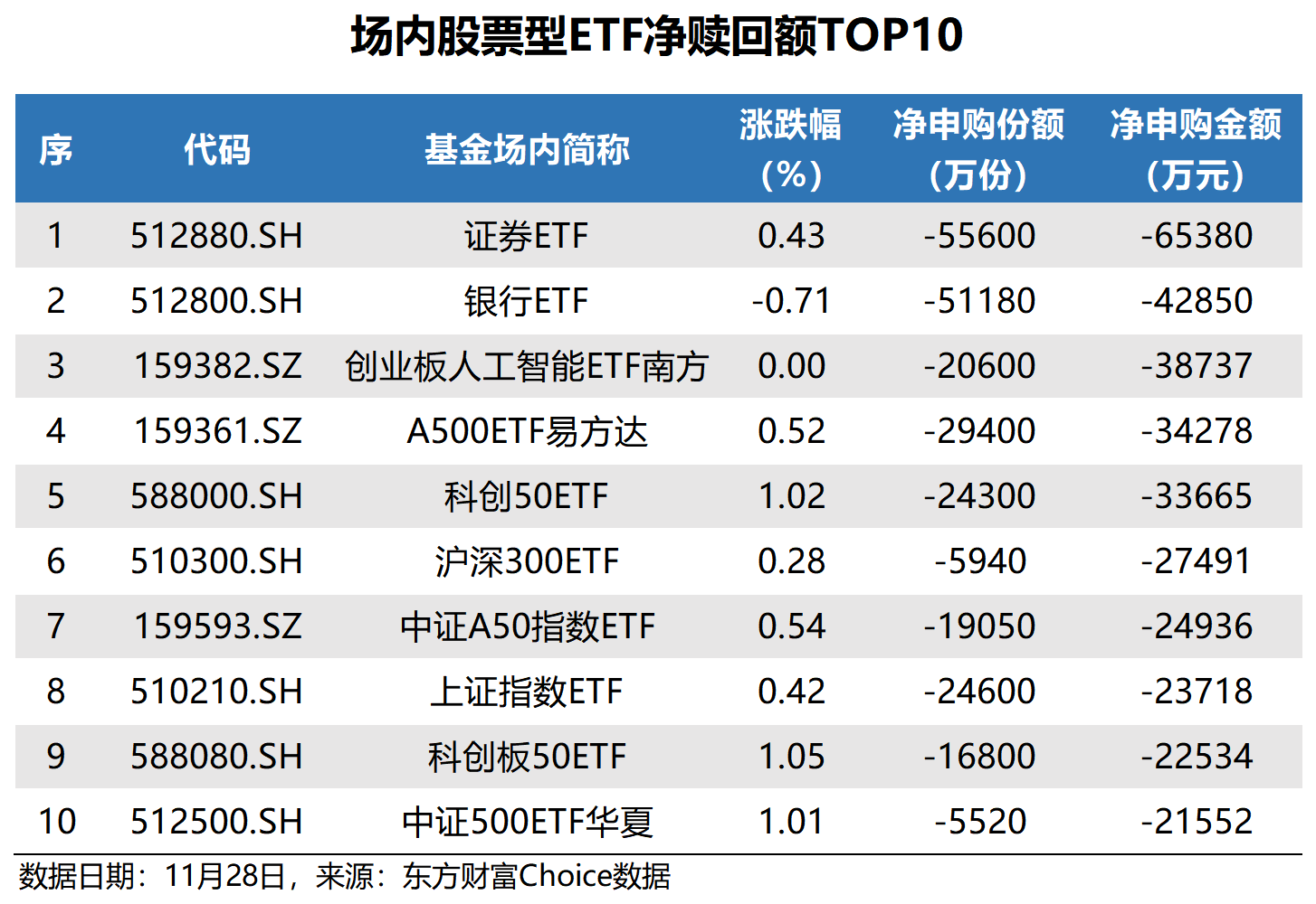 數(shù)據(jù)還顯示,上周五凈贖回金額最多的場內(nèi)股票型ETF為證券ETF,凈贖回金額6.54億元;銀行ETF緊隨其后,凈贖回金額4.29億元。