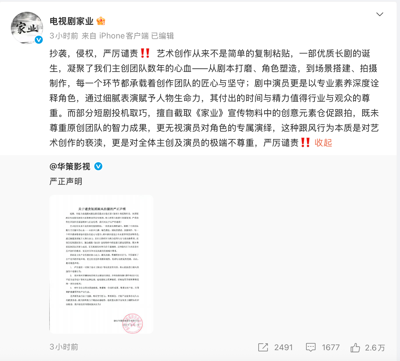 華策影視還稱,部分短劇投機取巧,擅自截取《家業(yè)》宣傳物料中的創(chuàng)意元素倉促跟拍,既未尊重原創(chuàng)團隊的智力成果,更無視演員對角色的專屬演繹,這種跟風行為本質是對藝術創(chuàng)作的褻瀆,更是對全體主創(chuàng)及演員的極端不尊重。