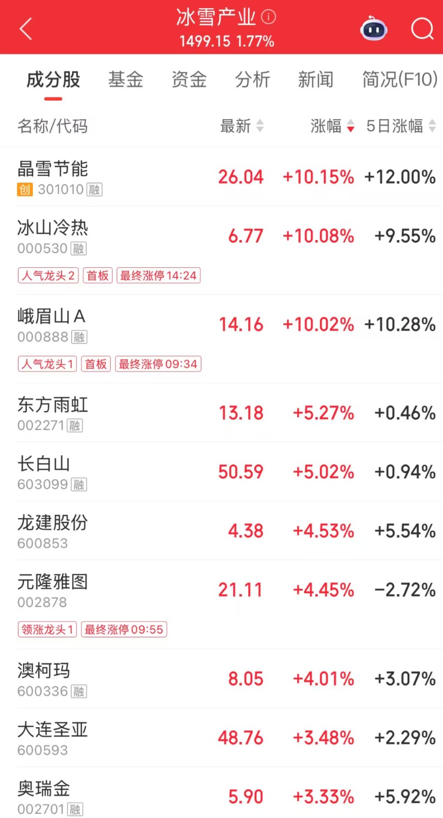 尾盤(pán),冰雪產(chǎn)業(yè)板塊異動(dòng)拉升,冰山冷熱直線(xiàn)漲停,晶雪節(jié)能漲超10%。