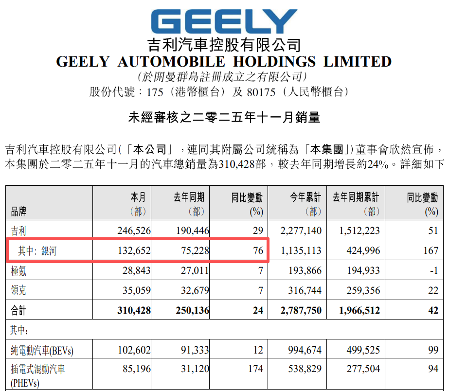 探究可見,吉利汽車的新能源汽車銷量主要來(lái)自吉利銀河,系吉利汽車推出的中高端新能源汽車品牌。2025年11月,吉利銀河的銷量達(dá)13.27萬(wàn)輛,同比增長(zhǎng)76%。