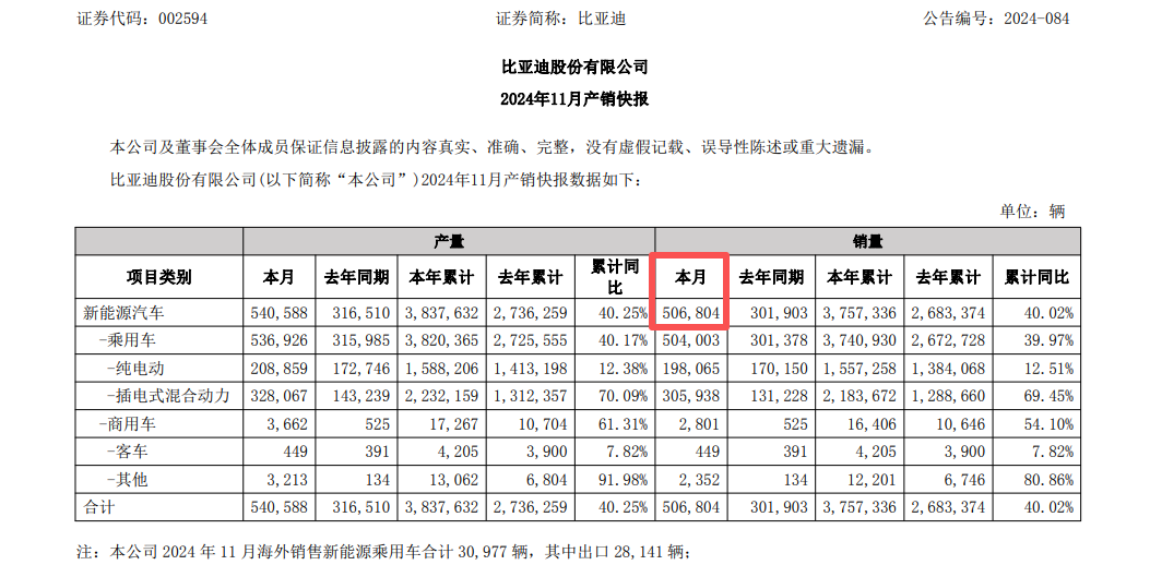 回顧2024年全年,比亞迪自10月開始,連續(xù)三個(gè)月的月度銷量均超50萬(wàn)輛。