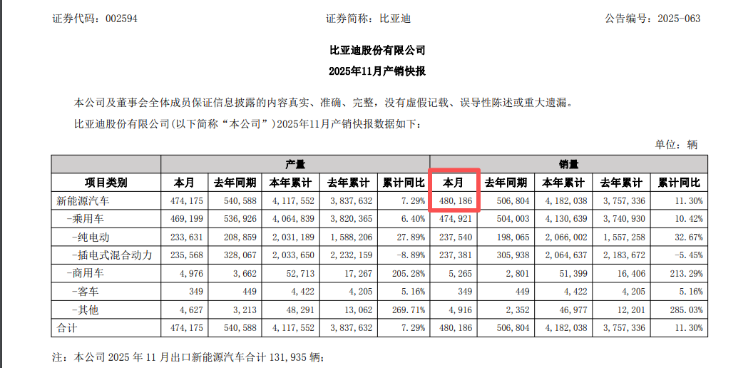 比亞迪2025年11月的銷量達(dá)48.02萬(wàn)輛,仍未能突破月銷50萬(wàn)輛的關(guān)口。