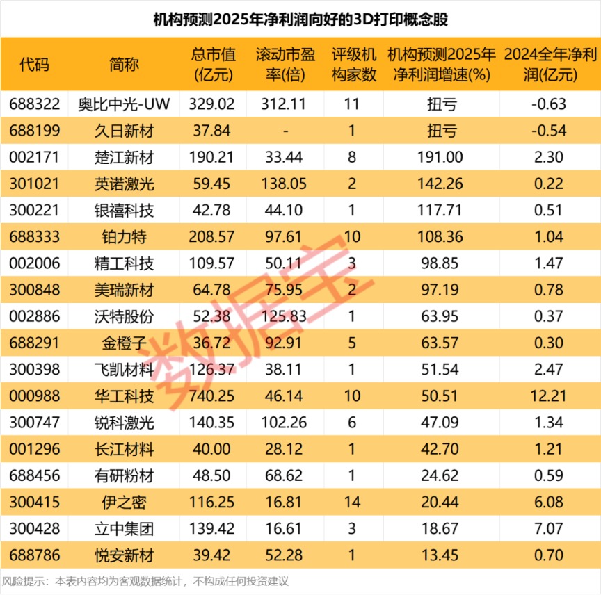 根據(jù)機(jī)構(gòu)一致預(yù)測(cè),楚江新材、英諾激光、銀禧科技、鉑力特在去年同期盈利基礎(chǔ)上,2025年凈利潤(rùn)有望翻倍;精工科技、美瑞新材、沃特股份、金橙子凈利潤(rùn)增幅緊隨其后,依次為98.85%、97.19%、63.95%、63.57%;奧比中光-UW、久日新材全年則有望實(shí)現(xiàn)扭虧為盈。