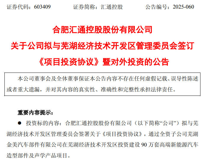 12月1日晚間,匯通控股(603409)公告,公司擬與蕪湖經(jīng)濟(jì)技術(shù)開發(fā)區(qū)管理委員會簽署關(guān)于《項目投資協(xié)議》,通過全資子公司蕪湖金美汽車部件有限公司在蕪湖經(jīng)濟(jì)技術(shù)開發(fā)區(qū)投資建設(shè)90萬套高端新能源汽車造型部件及聲學(xué)產(chǎn)品項目。