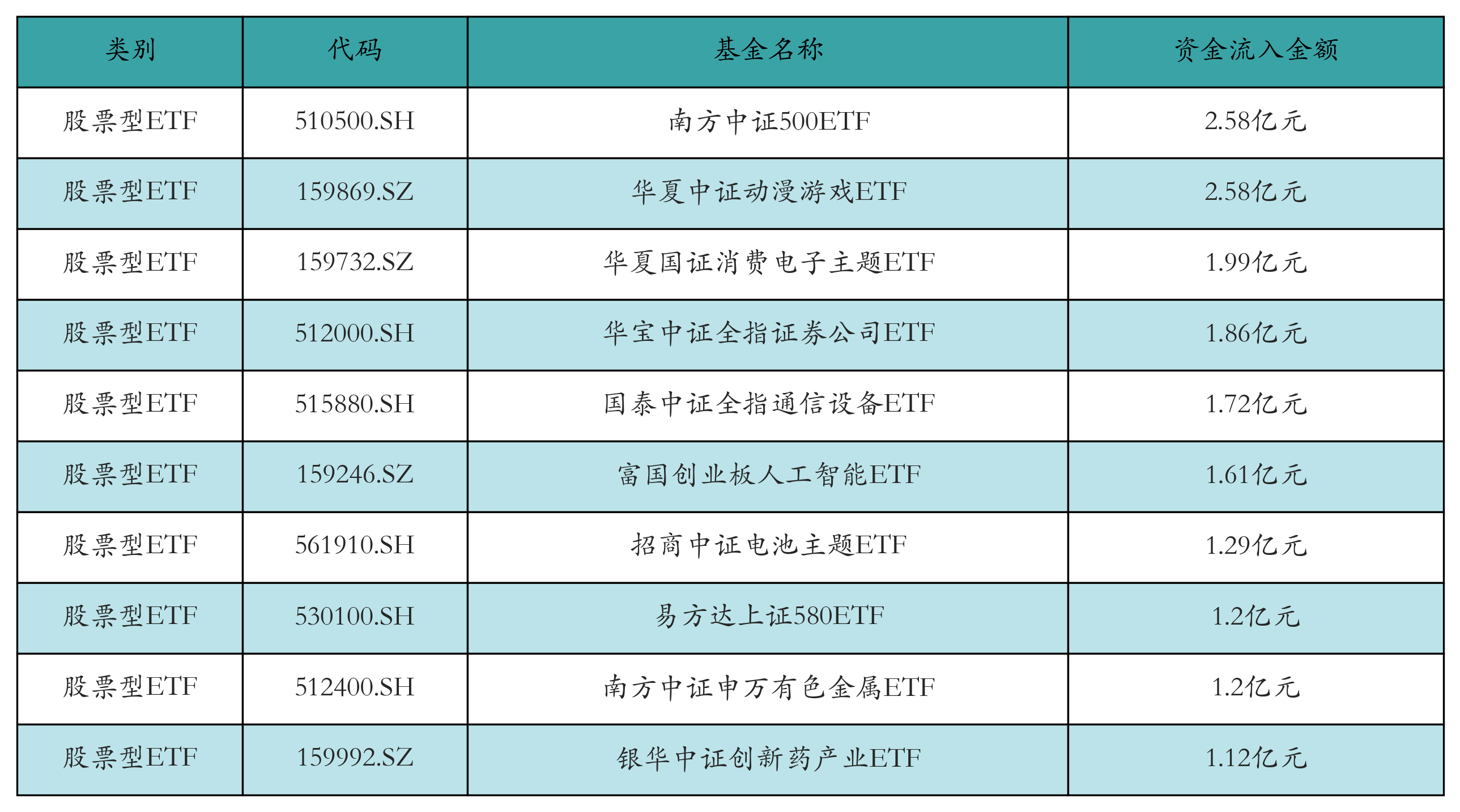 昨日股票型ETF資金流入最多的3只ETF及其流入金額分別為:南方中證500ETF(流入2.58億元)、華夏中證動(dòng)漫游戲ETF(流入2.58億元)、華夏國(guó)證消費(fèi)電子主題ETF(流入1.99億元)。資金流入前10詳情見(jiàn)下表: