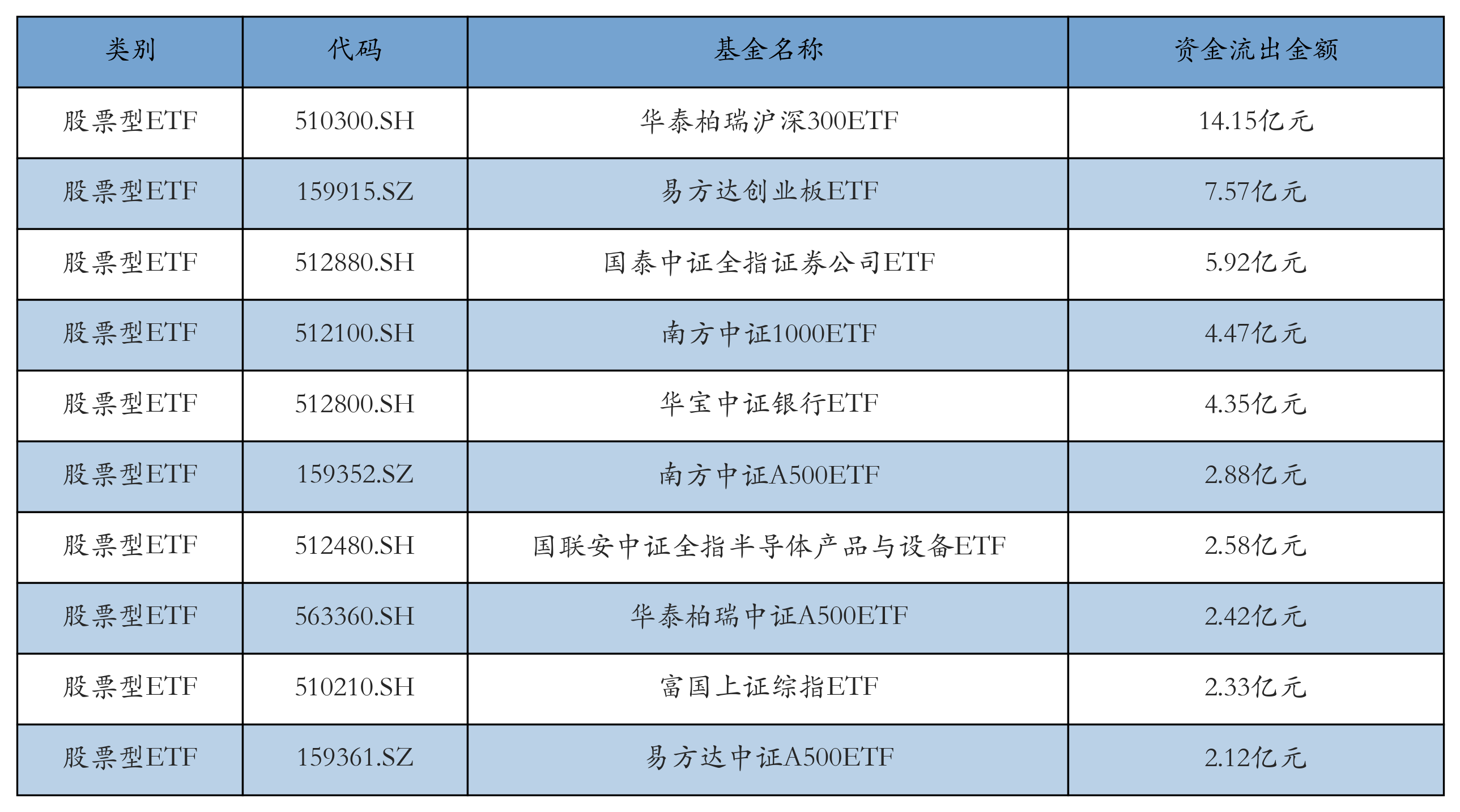 昨日股票型ETF資金流出最多的3只ETF及其流出金額分別為:華泰柏瑞滬深300ETF(流出14.15億元)、易方達(dá)創(chuàng)業(yè)板ETF(流出7.57億元)、國(guó)泰中證全指證券公司ETF(流出5.92億元)。資金流出前10詳情見(jiàn)下表:
