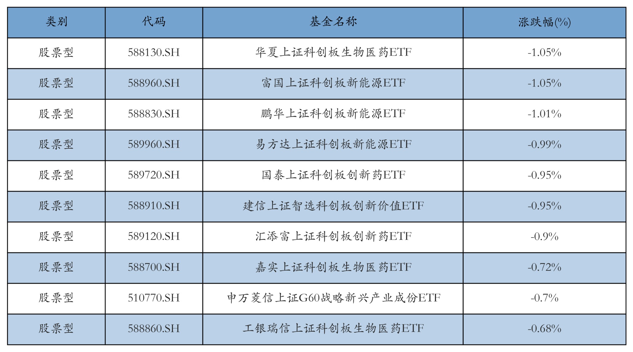 昨日股票型ETF跌幅最大的3只ETF及其收益率分別為:華夏上證科創(chuàng)板生物醫(yī)藥ETF(-1.05%)、富國(guó)上證科創(chuàng)板新能源ETF(-1.05%)、鵬華上證科創(chuàng)板新能源ETF(-1.01%)。跌幅前10詳情見(jiàn)下表: