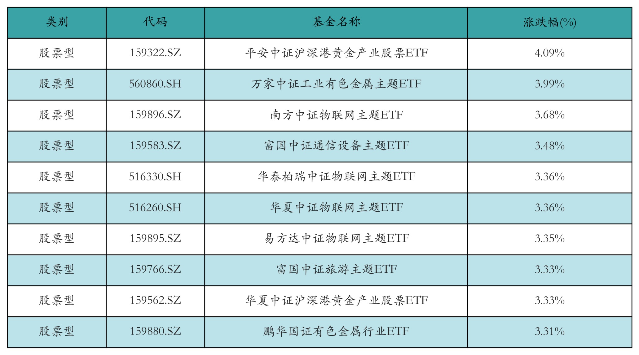 昨日股票型ETF漲幅最高的3只ETF及其收益率分別為:平安中證滬深港黃金產(chǎn)業(yè)股票ETF(4.09%)、萬(wàn)家中證工業(yè)有色金屬主題ETF(3.99%)、南方中證物聯(lián)網(wǎng)主題ETF(3.68%)。漲幅前10詳情見(jiàn)下表: